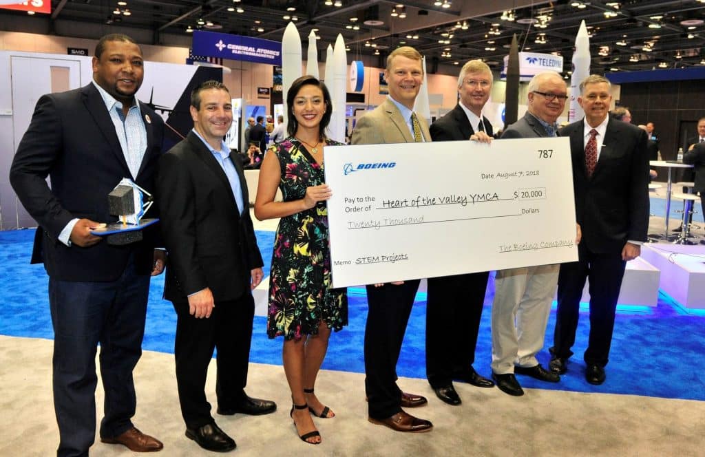 The Heart of the Valley is incredibly grateful for the support of The Boeing Company for the YMCA’s STEM Education programs. Boeing generously donated $20,000 to the Y during the Space & Missile Defense Symposium on August 8. The donation will be used to provide resources in the Science, Technology, Engineering and Math for the YMCA’s Afterschool, Early Childhood Education, and Power Scholars Academy Summer Learning Loss Prevention programs. From left: Lamont Singleton, YMCA Director of Youth Development & Social Responsibility; David Bier, YMCA Board Member; Ginger Harper, YMCA Board Immediate Past President; Jeff Gronberg, YMCA Board President; Norm Tew, Vice President and General Manager, Boeing Missile and Weapon Systems; Jerry Courtney, Heart of the Valley YMCA President/CEO; Bill Phillips, Vice President, Boeing Global Sales and Marketing.